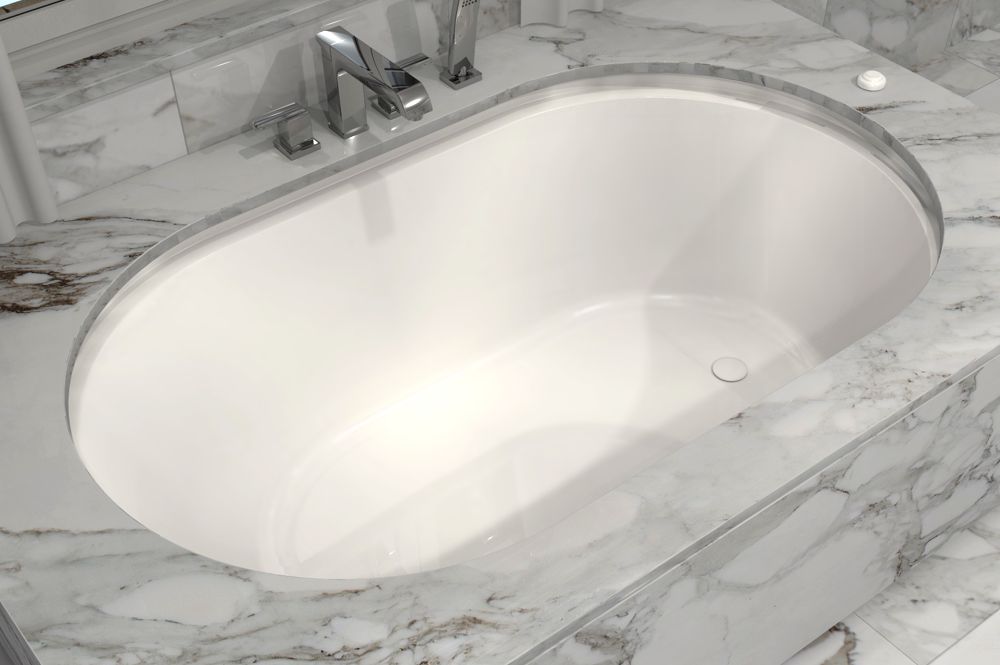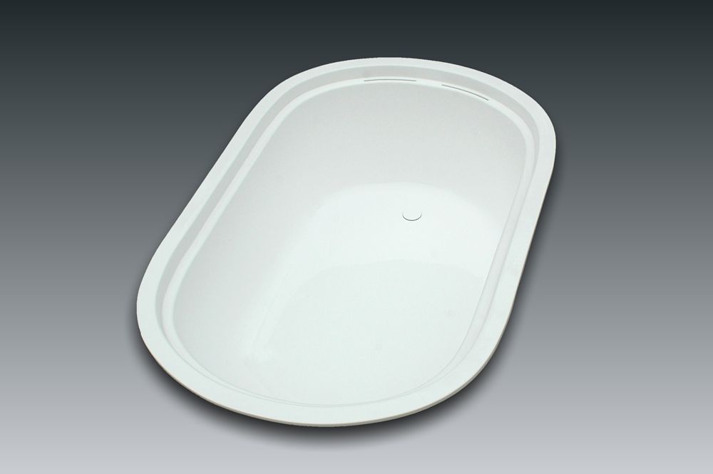 Deep tub designed for underneath installation. Peripheral overflow device.